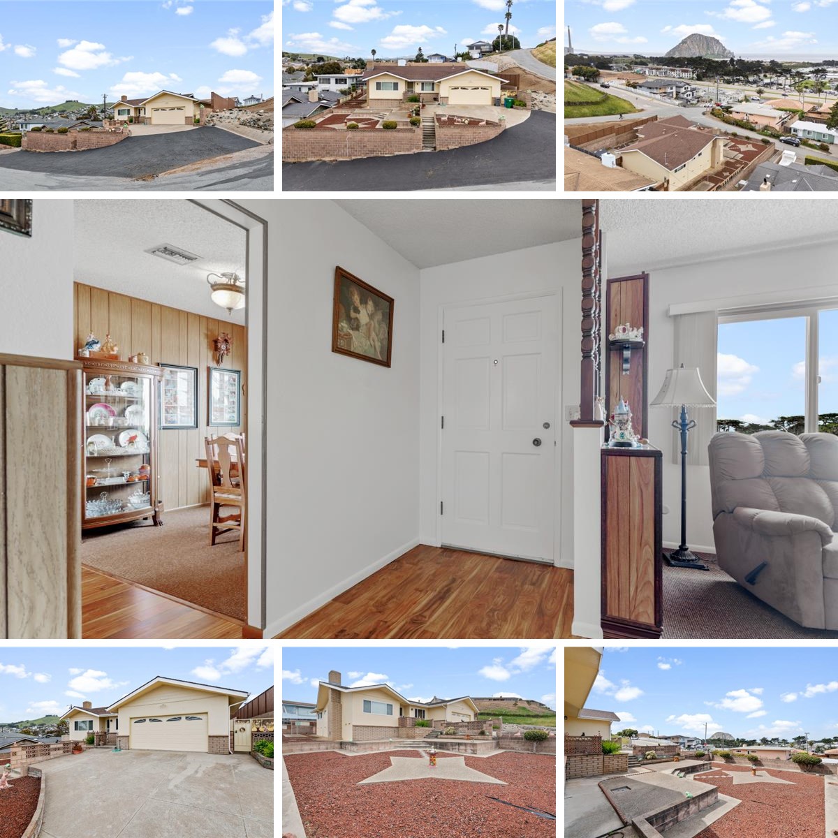 Single level ocean and Rock view 3 bedroom, 2 bath home with an attached two car garage on an oversized corner lot. This immaculate home has been very well maintained and features newer dual pane windows and a newer 40 year roof. The west facing living room window frames amazing views of Morro Rock and the ocean which can also be seen from many of the patios that surround the home. This home is a solidly built, low maintenance stucco home with all of the eaves boxed in. The 7500+ square foot lot provides many patios, planters and extra off street parking. There is extra storage space under the house in the generous sub-area. It is difficult to find a single level home on such a large lot with the bonus of great views in Morro Bay!