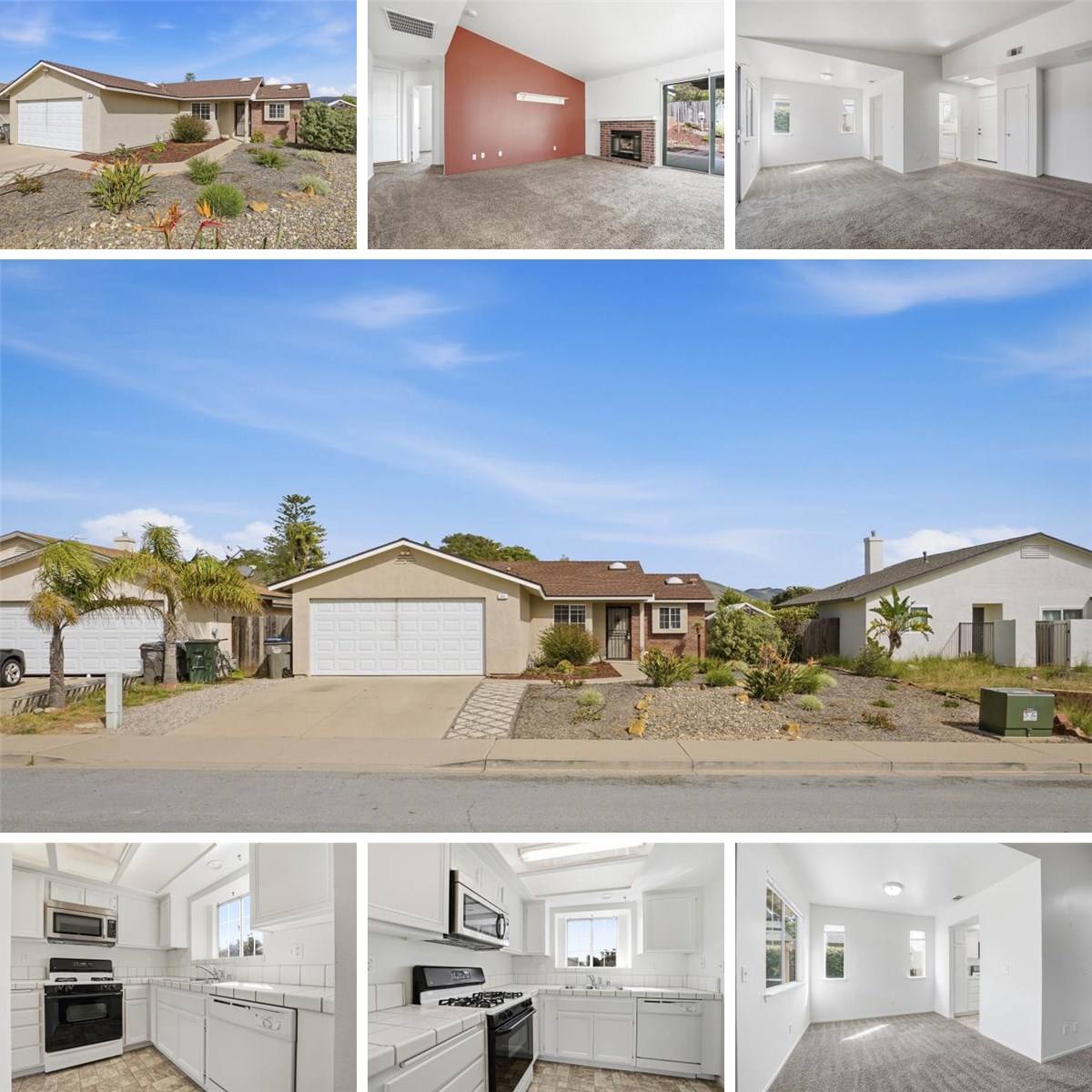 Welcome to this move-in ready 3 bedroom, 2 bath single-level home in a fantastic Nipomo location. The entry flows seamlessly into the kitchen, dining area, and living room, creating an inviting space that feels open yet cozy. The living room features a warm gas fireplace with classic brick surround and a sliding glass door that leads directly to the expansive backyard. The spacious primary suite includes a full ensuite bath and its own glass slider providing private access to the backyard. Two additional bedrooms offer versatility for guests, a home office, or hobbies. Step outside to a large fenced backyard with a generous covered patio, perfect for year-round entertaining. The front yard is designed for low maintenance living and features drip irrigation for easy care. Additional highlights include an indoor laundry area, attached 2-car garage, newer roof, and a newer heating unit. This is a wonderful opportunity to own a beautiful single level home in a great neighborhood and make it your own!